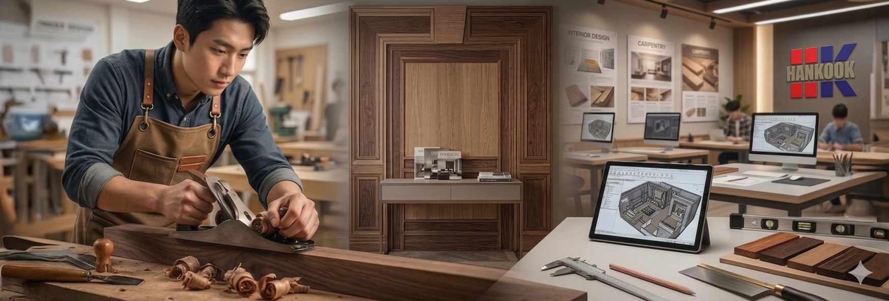공구와 기계장비를 사용하여 건축구조물을 제작하고 목재 가공과 시공, 인테리어필름 내부공사를 교육하는 과정